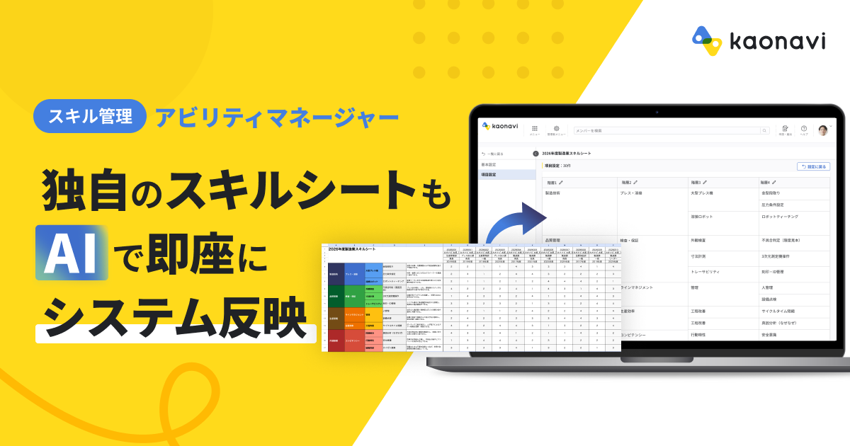 株式会社カオナビ(本社:東京渋谷区、代表取締役社長 Co-CEO:佐藤 寛之、以下:当社)が提供するタレントマネジメントシステム「カオナビ」は、スキルの定義付けから見える化までをワンストップで実現させる新機能「アビリティマネージャー」を2024年3月13日より提供開始します。